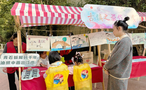 本次活動的核心展區是第七期“古鎮之旅”的成果展示。背景墻上呈現著一幅幅研學途中抓拍的精彩照片,來自車坊社區的少年們穿梭于小橋流水之間,駐足于古老宅院之前,認真聆聽、細致記錄的身影,瞬間將觀眾帶入了那段充滿探索的旅程。與照片相呼應的,是孩子們創作的古鎮主題繪畫作品展。水墨氤氳的江南水鄉、線條精巧的石橋古建、充滿生活氣息的街巷場景……少年們用純真的視角和斑斕的色彩,將他們對于“詩意水鄉”的理解與想象傾注于筆端,讓古老的江南風貌煥發出全新的童趣與活力。