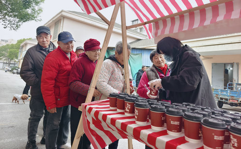一碗熱氣騰騰的湯圓,是這場相聚中溫情的注腳。金益社區小區門口甜香四溢,社區工作人員、物業人員“紅色管家”志愿者們早早煮好湯圓,保溫靜置、分裝整齊,遞予過往居民。大家捧著溫熱的瓷碗,有人現場品嘗,有人打包分享,一句句“謝謝”“趁熱吃”讓暖意在街巷間流動。志愿者們還將湯圓送到保安、保潔手中,致敬這些默默堅守一線的守護者。