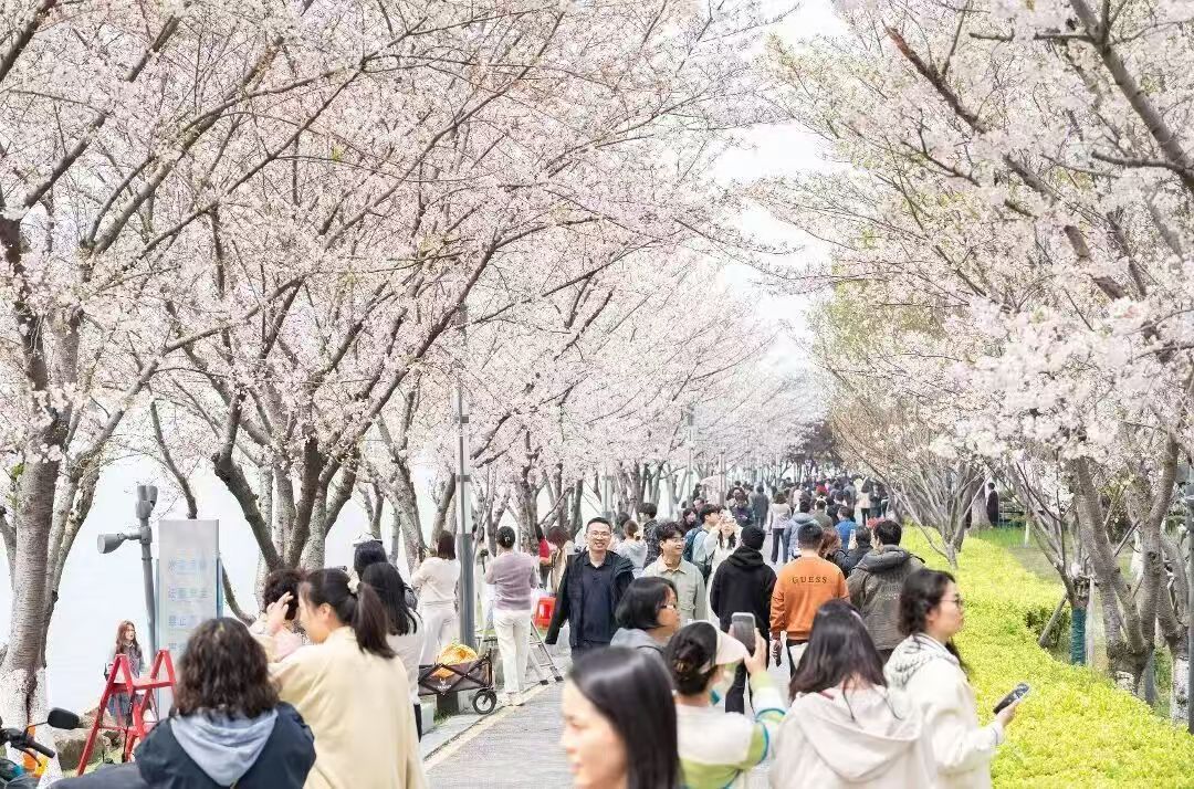 城市公園亦是市民游客放松身心的好去處,環金雞湖、獨墅湖、陽澄湖的城市公園內,同樣游人如織。市民游客踏春而來,在湖畔公園間邂逅春光,收藏獨屬于園區的春日盛景,湖濱公園、白塘公園、仙櫻湖公園、白鷺園等花開爛漫。右岸會客廳“飛翔”雕塑下,魯冰花正熱烈盛放,挺拔的花穗層層疊疊、深淺暈染,打卡游客絡繹不絕;世尊櫻花大道、現代大道櫻花如云似霞,陸涇路海棠花廊粉浪翻涌,游客們或駐足賞花、或拍照留念,沉醉在無邊春色里。