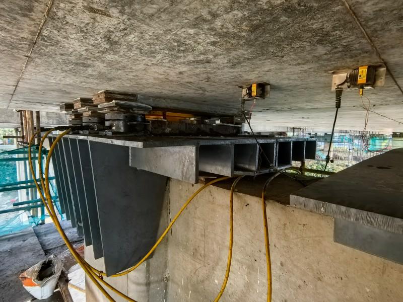 本次施工摒棄傳統(tǒng)斷交作業(yè)模式,首次較大規(guī)模將“PLC計(jì)算機(jī)控制整體同步頂升”這項(xiàng)新工藝應(yīng)用于園區(qū)重要高架基建設(shè)施。作業(yè)依托液壓同步控制技術(shù),在橋梁關(guān)鍵點(diǎn)位布設(shè)大噸位超薄千斤頂與高精度傳感器,由中央控制系統(tǒng)實(shí)時(shí)采集數(shù)據(jù)、動(dòng)態(tài)調(diào)節(jié)頂升力,實(shí)現(xiàn)整聯(lián)梁體平穩(wěn)均勻抬升。施工嚴(yán)格執(zhí)行“分級(jí)加載、微量同步”原則,單級(jí)頂升高度不超過(guò)2毫米,點(diǎn)位同步誤差更是控制在0.5毫米以內(nèi),真正達(dá)成“無(wú)感頂升、精準(zhǔn)置換”目標(biāo),將老舊板式橡膠支座全部更換為承載更強(qiáng)、耐久性更優(yōu)的盆式支座。