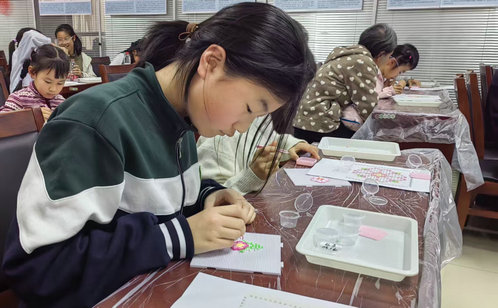 手工拼豆DIY活動率先拉開帷幕。志愿者老師生動講解后,孩子們在“小老師”助教團隊的指導下,手持鑷子,專注地將五彩斑斕的豆粒排列組合,不一會兒,一朵朵小花便呈現在大家手中。