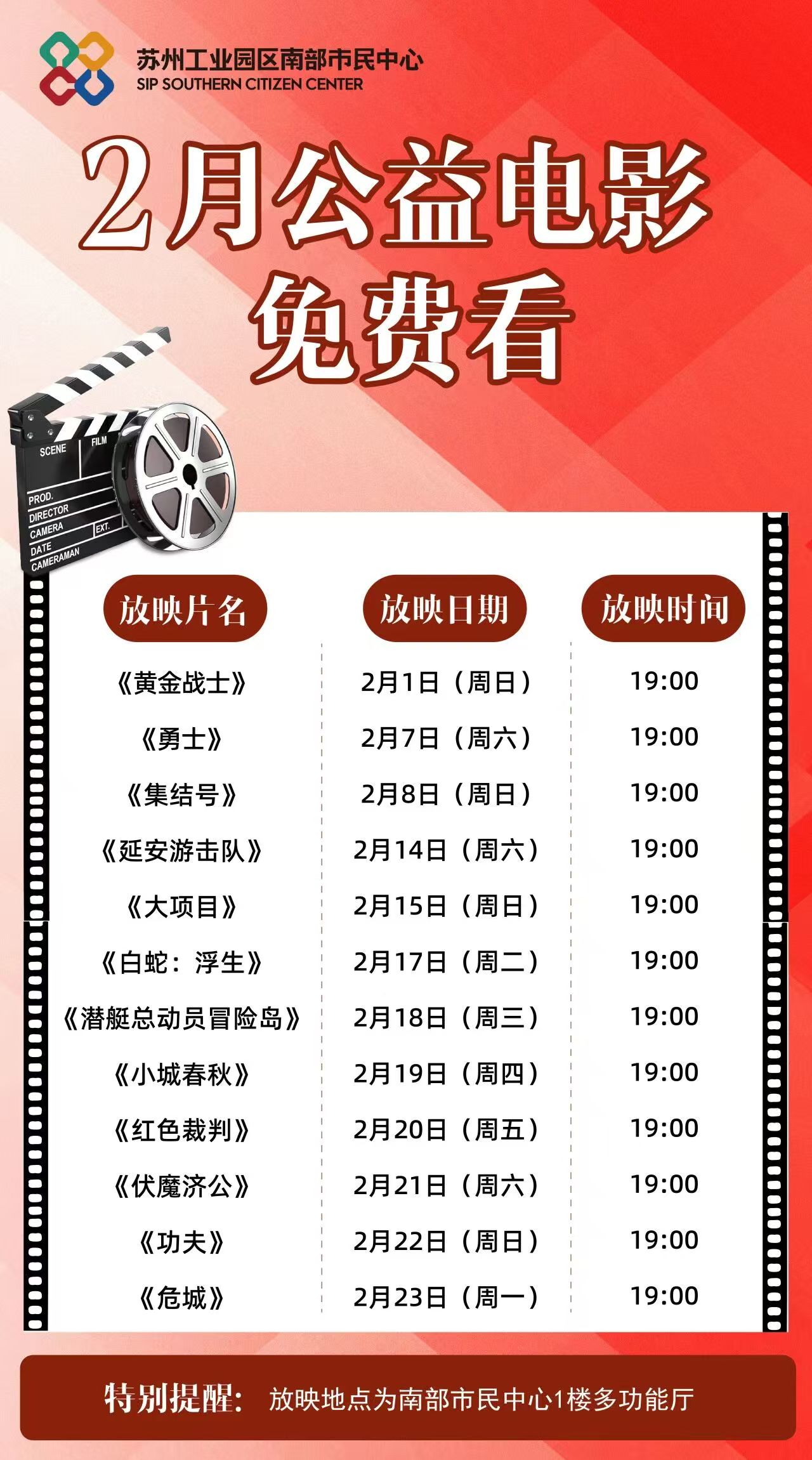 春節(jié)期間,文化惠民不打烊。園區(qū)南部、北部市民中心將推出公益電影展映,二十余場經(jīng)典影片免費播放,包括《白蛇:浮生》《小城春秋》《功夫》等等,讓市民在團圓之余,享受一份輕松愉悅的光影之樂。