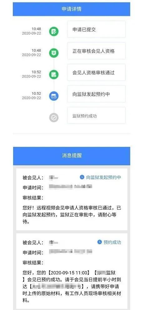向監(jiān)獄預(yù)約成功后,工作人員會將會見時間、地點(diǎn)及相關(guān)要求通過“消息提醒”和手機(jī)短信發(fā)送給家屬,請注意查收。
