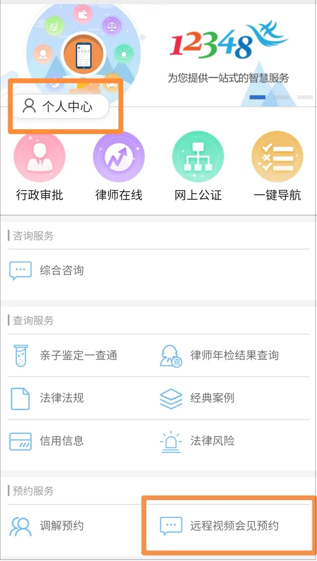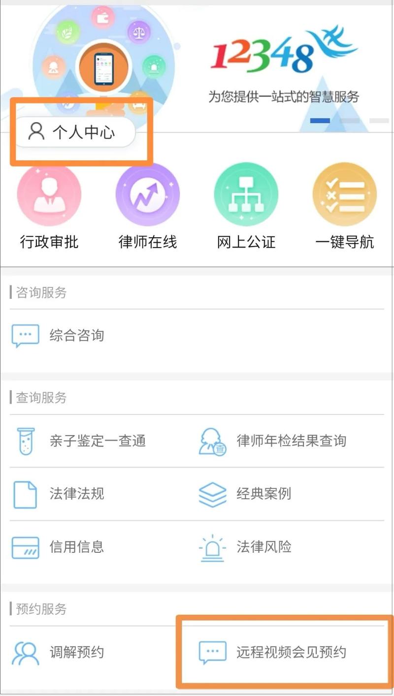 第二步:進(jìn)入公眾號后,點(diǎn)擊頁面底端“法律服務(wù)”,新用戶需要先點(diǎn)擊左上角的“個人中心”進(jìn)行注冊。注冊后,在法律服務(wù)頁面“預(yù)約服務(wù)”板塊點(diǎn)擊“遠(yuǎn)程視頻會見預(yù)約”。
