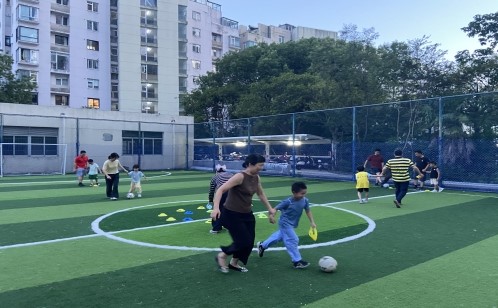 The 600-square-meter artificial turf enclosed by the two-meter-high safety net with the facial recognition access control system provides residents in Sijixin Community with a good place to indulge their passion for football that has been ignited by the ongoing Jiangsu Football City League.