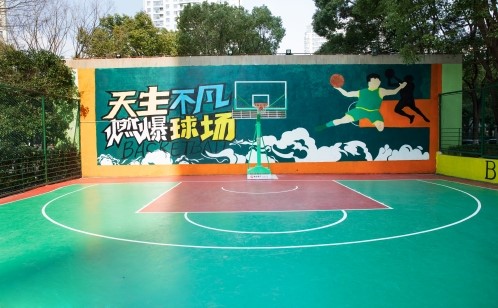 The basketball court in Linglongwan Community boasts a vibrantly painted mural, enhancing the dynamic and energetic atmosphere for everyone who play here.