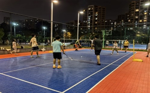 The 150-square-meter badminton court in Zhonghai Community features professional lighting for night matches, and convenient access to nearby shopping spots and parking lots.