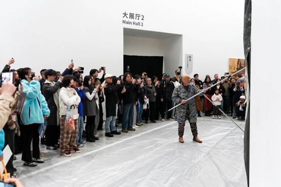 At the opening ceremony, Yang presented an impromptu artistic creation, using discarded materials such as old canvas, waste paper and paint as his medium to complete an artwork on site.