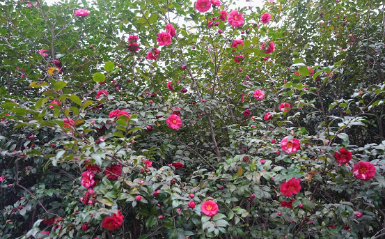 The camellias have also quietly bloomed, adding a touch of rich, gentle color to the season. Each camellia plant stands straight and tall, with layers of petals spreading out, becoming even more enchanting against the backdrop of green leaves.