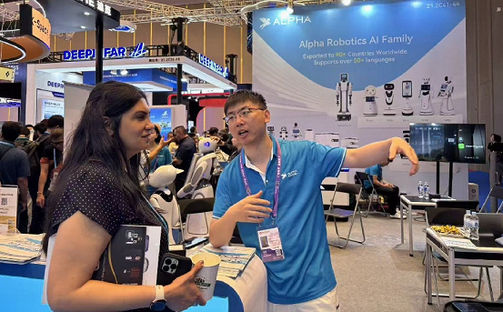 Suzhou Alpha Robotics Co Ltd showcases service robots for last-mile delivery, reception and security inspection, and robots equipped with embodied AI, attracting many domestic and international purchasers.