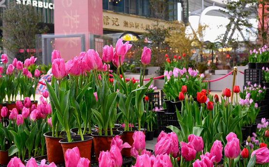 At the central square along Tianmu East and West Streets, diverse elegant blossoms including pure-white narcissus, golden double-petaled daffodils, sweet camellias, graceful phalaenopsis and colorful tulips drew crowds of passersby, who paused to admire the dazzling floral displays.