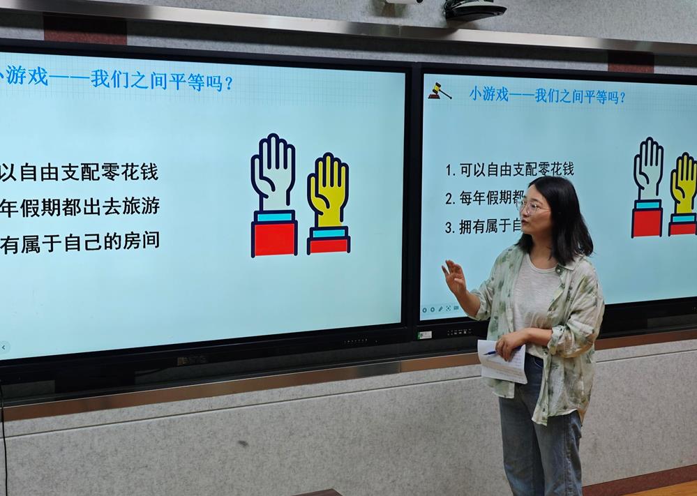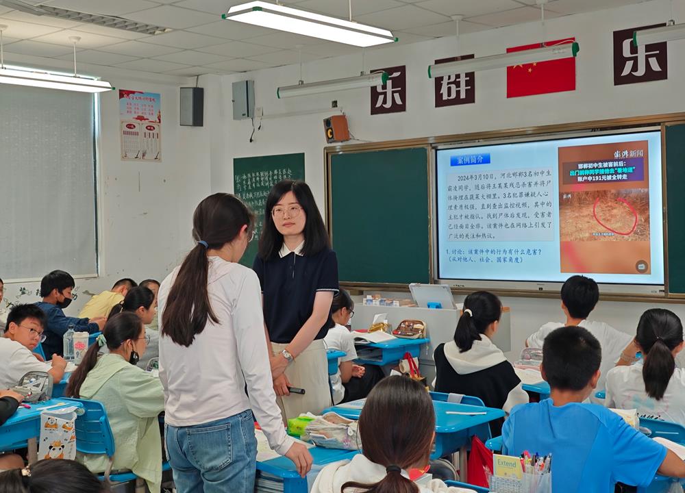 星海實驗初級中學(xué)的陳燕秋老師以“嚴(yán)于律己:守住行為邊界做自律好少年”為總議題展開,通過設(shè)置“年齡小”=“免罰牌”?“小錯”釀成“大罪”?“自縛”還是“自由”?等三個問題,帶領(lǐng)學(xué)生探尋法律責(zé)任的真相,認(rèn)清不良行為的演變陷阱,體會自律帶來真正的自由。