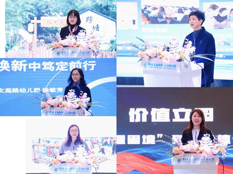 新時代的好幼兒園是什么樣的?新時代如何做一名好園長?在“園長說”環節,五位公民辦幼兒園園長代表圍繞話題分享了自身的思考與實踐:跨塘中心幼兒園園長邵愛英講述了帶領老園不斷深耕內涵的探索,通過調研反思、教研改進等路徑,促使課程建設從“有形框架”走向“有魂實踐”;文苑路幼兒園園長徐敏芳圍繞園本“和樂”理念如何做好傳承與創新、如何與當下教育使命適配的深度思考,闡述了“人”為核心構建新型家園社協同共育關系、構建正能量生態圈、凝聚教育合力的實踐歷程;新月啟元幼兒園園長李錚錚分享了民辦幼兒園在“優質普惠”發展背景下,以新質育人夯實內涵、以協同融合共促發展的持續探索;錦溪幼兒園園長吳臻圍繞制度共建、人文關懷等內容,闡述園所民轉公以來促使團隊從“兩股勁”擰成“一條心”的管理智慧;文景幼兒園園長曹圓圓分享了以“黨建+教育”深度融合打造教育引力場的創新實踐。五位園長真知灼見的分享,既有實踐深度,又有情感溫度,讓大家見證了教育初心,更看到了她們帶領團隊破局的勇氣與智慧。