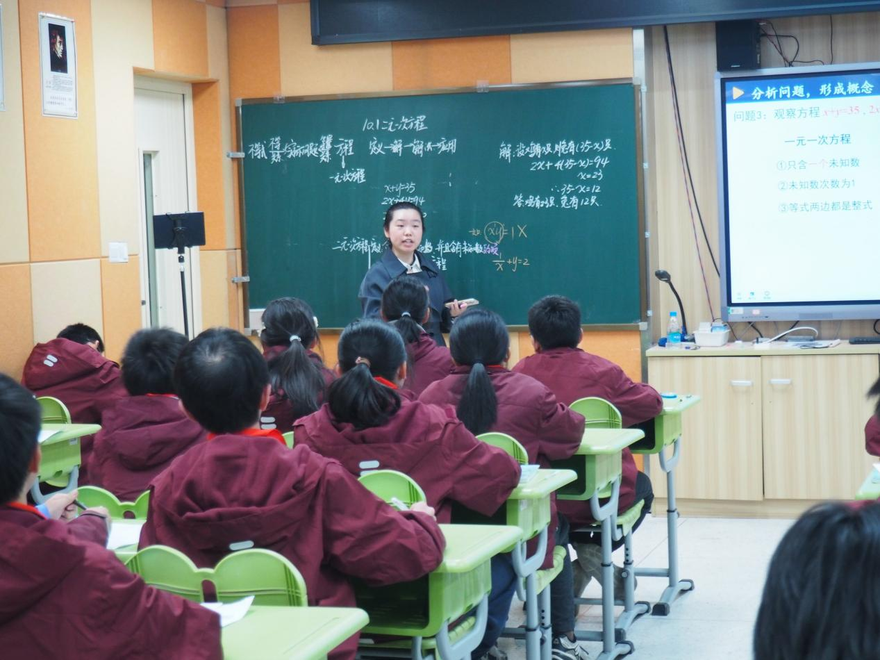 概念教學《二元一次方程》:星匯學校周茂乾老師以《孫子算經》“雞兔同籠” 經典古題導入,回顧小學算術法與一元一次方程解法,通過設問提煉兩個未知量,自然引出二元一次方程,依托舊知生長新知,滲透數學文化。借助籃球聯賽積分問題列式建模,歸納生成二元一次方程定義,概念辨析環節運用AI 闖關 PK 小游戲,依靠 AI 即時反饋、趣味競技的優勢,調動積極性、活躍課堂,高效鞏固概念辨析。學生枚舉找出符合實際的輸贏場數,自主歸納二元一次方程解的概念,再通過網絡畫板將每一組數對化作坐標點,直觀匯聚成直線,數形結合直觀易懂,同時為后續一次函數學習鋪墊伏筆。結尾聯動AI 智能對話體,學生實時向笛卡爾提問互動,依托 AI 即時答疑、文史科的特點,拓寬數學視野,提升課堂人文意蘊。整節課兼顧概念建構、思維進階與智能技術融合,落實核心素養。