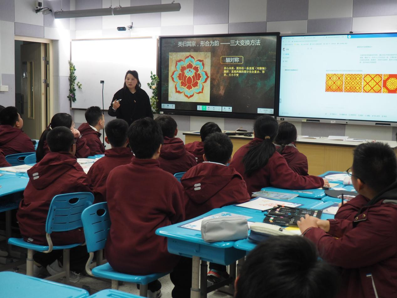 應用教學《綜合與實踐——古韻新生:圖形變換與傳統紋樣設計》:星浦實驗中學王歡老師通過對中國傳統回紋、寶相花紋、藻井紋等經典紋樣構成規律的探究,進一步體會其背后所蘊含的平移、旋轉、軸對稱三大圖形變換的數學本質,讓學生學會用數學的眼光觀察傳統紋樣的對稱與秩序之美,用數學的思維分析紋樣的生成邏輯與變換原理,用數學的語言論證圖形的位置關系與結構特征,并借助AI互動小程序實現傳統紋樣的創作與生成,在實踐中感受數學與傳統文化、現代科技的融合之美。