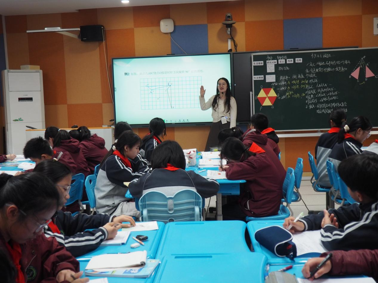 規則教學《旋轉(1)》:景城學校郭雪婷老師以平移、軸對稱舊知引入,結合生活情境引導學生探究旋轉要素。學生們積極思考、主動互動,在圖形對應關系分析、正六邊形實例探究中踴躍發言,在有網格和無網格的旋轉作圖練習里認真實操,高效掌握旋轉核心特征。課堂通過類比探究,引導學生研究幾何圖形變換,既培養了學生的幾何作圖與邏輯思維能力,也為后續旋轉性質應用筑牢基礎。